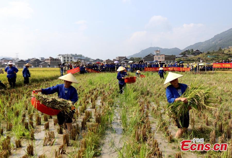 Women of Dong ethnic group compete in harvesting rice in Sanjiang Dong Autonomous County, Liuzhou City, South China’s Guangxi Zhuang Autonomous Region, Oct. 11, 2019. Over 100 women competed in the contest organized by the women’s federation in the county. Locals raise fish in the rice field to improve the quality of rice and boost the income. (Photo: China News Service/Wu LianXun)