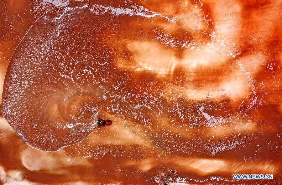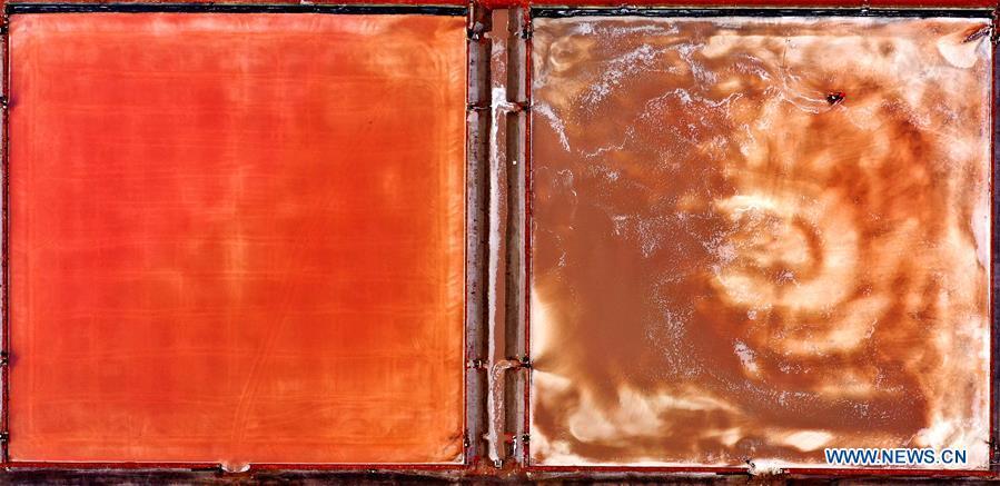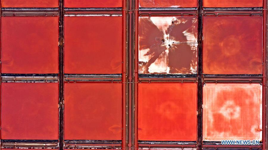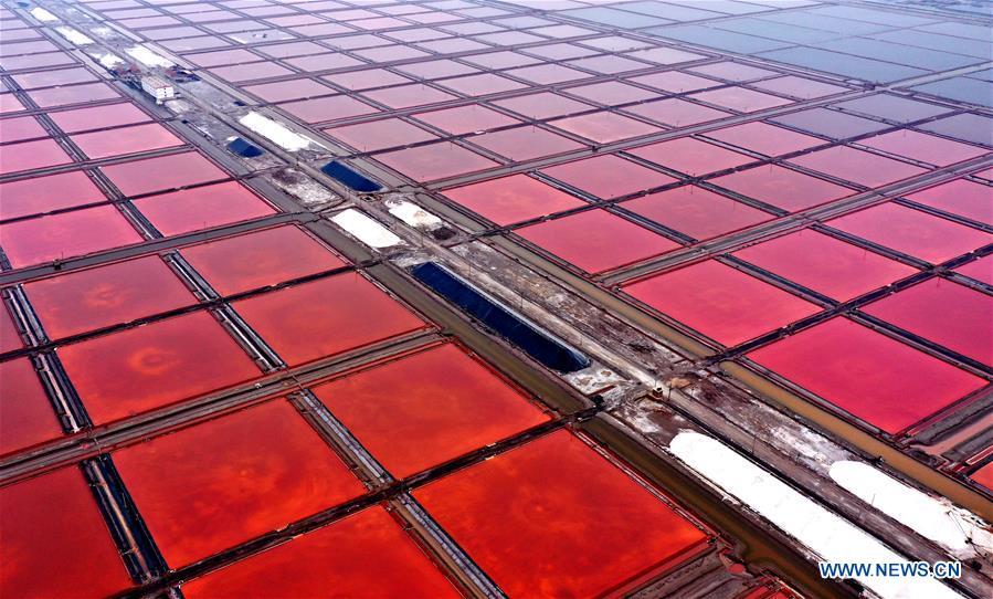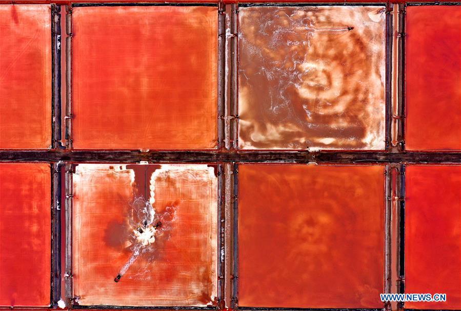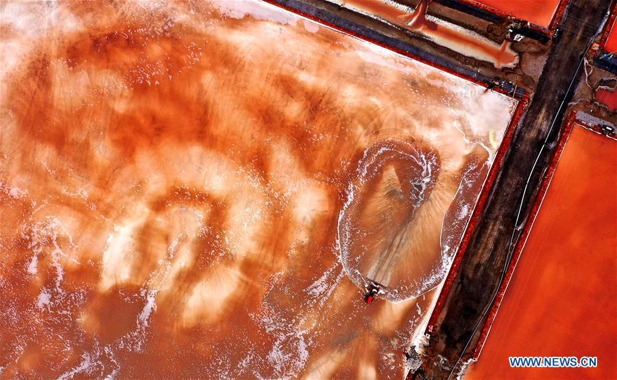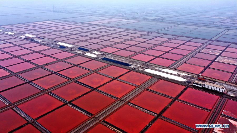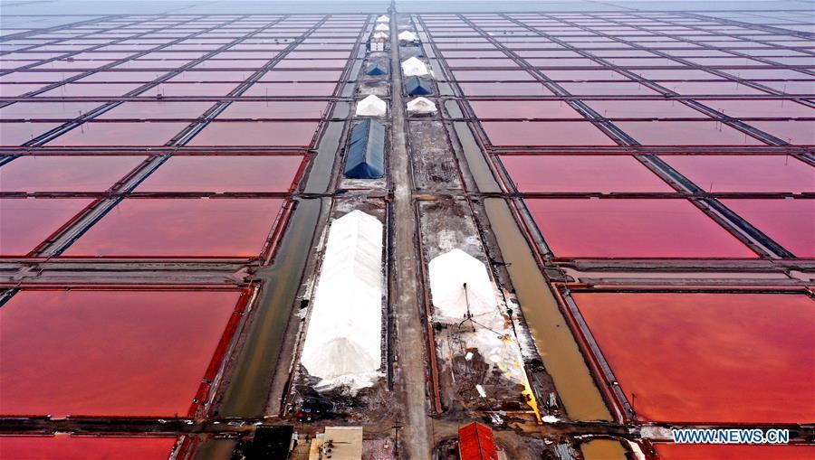 Aerial photo taken on Oct. 9, 2019 shows the Lubei salt mine in Wudi County, east China's Shandong Province. Lubei salt mine has entered the harvest season recently. With 36,500 hectares of salt fields, Wudi County is one of the most important sea salt production bases in China. (Xinhua/Zhu Zheng)