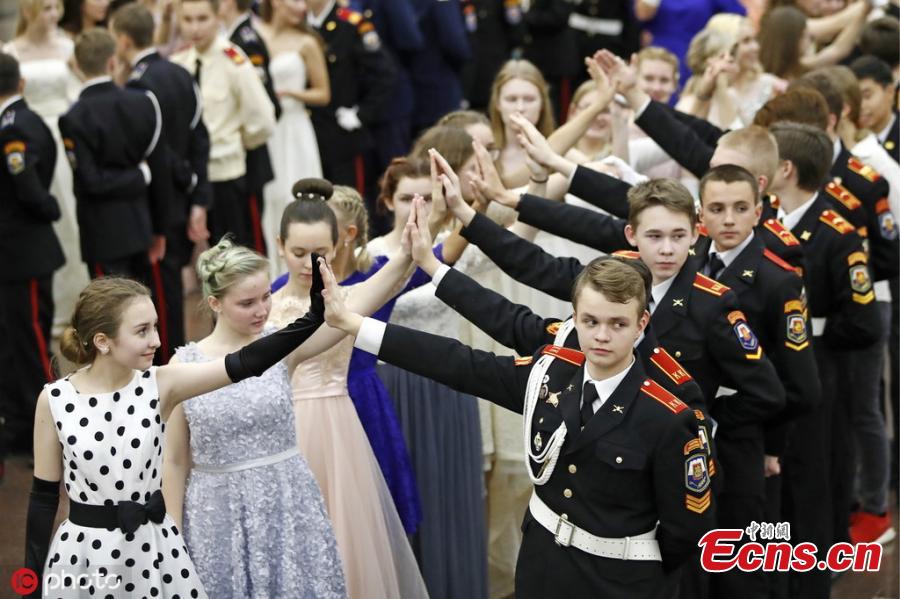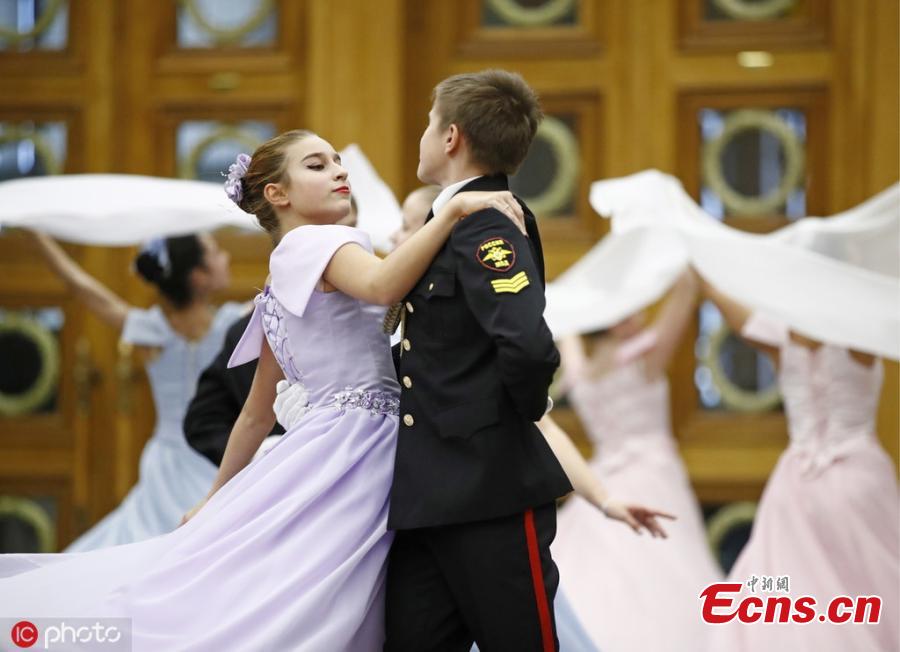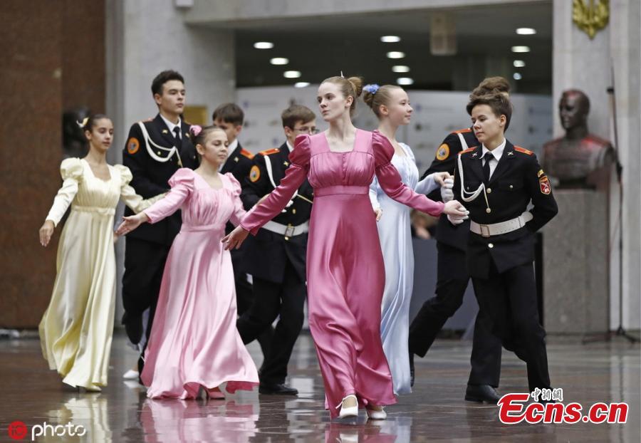 Young people dance during a cadet ball at the Victory Museum on Moscow's Poklonnaya Hill on October 13, 2019. (Photo/IC)