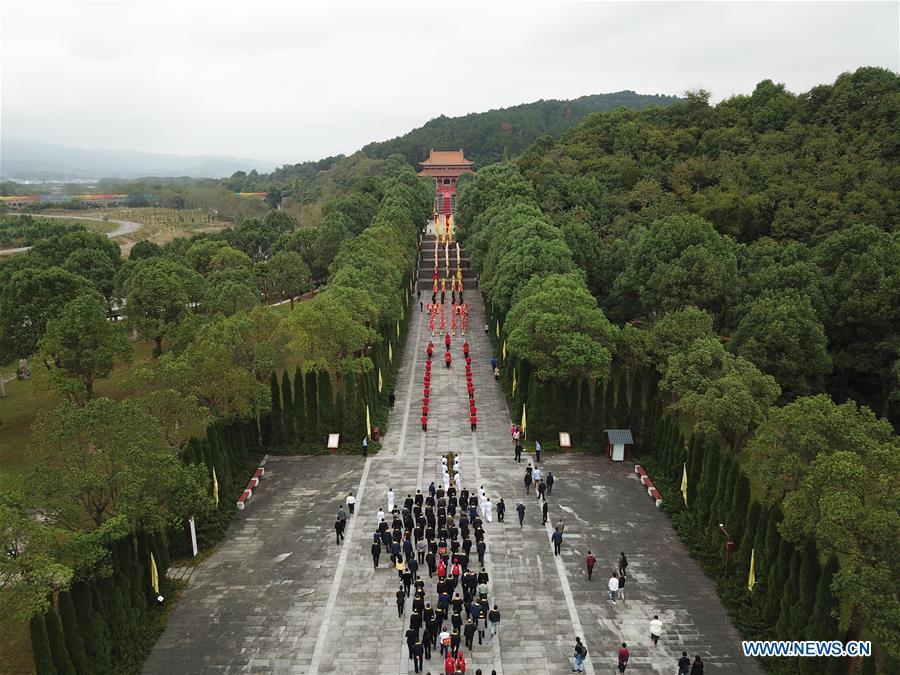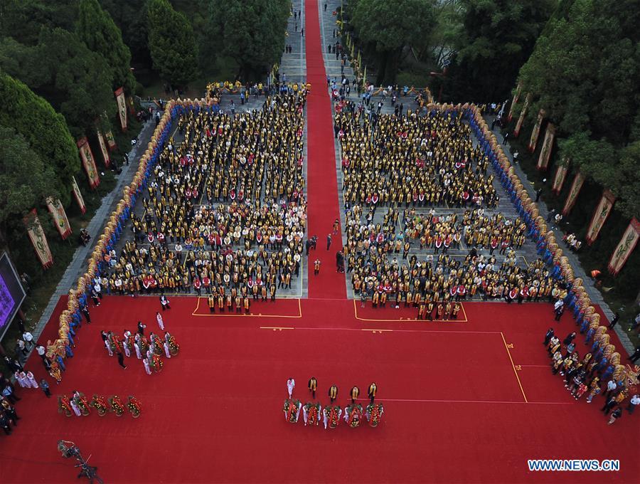 People take part in a ceremony to pay homage to Emperor Yandi, a legendary ancestor of the Chinese nation, in Yanling County, where the mausoleum of Emperor Yandi is located, in central China's Hunan Province, Oct. 13, 2019. Some 5,000 people took part in the ceremony on Sunday. (Xinhua/Chen Zhenhai)