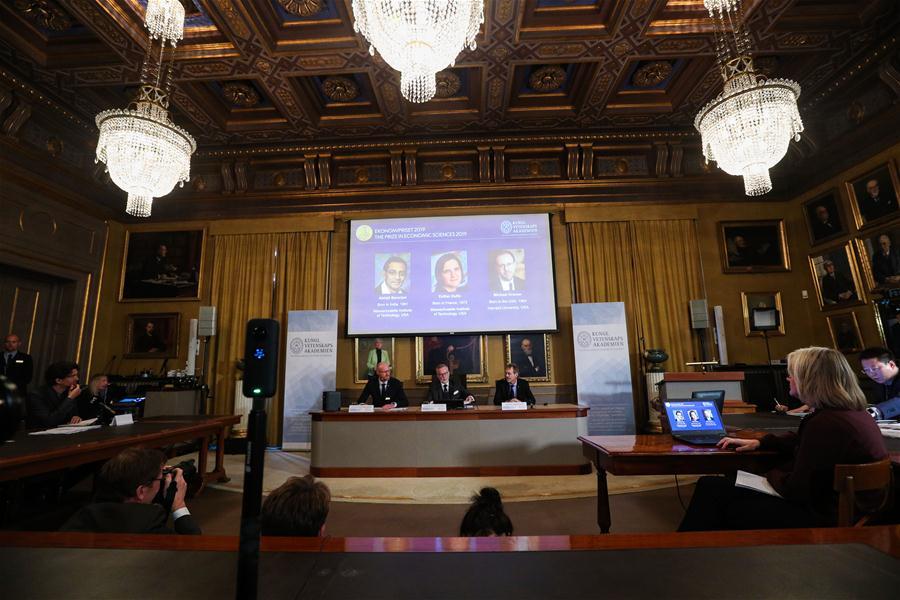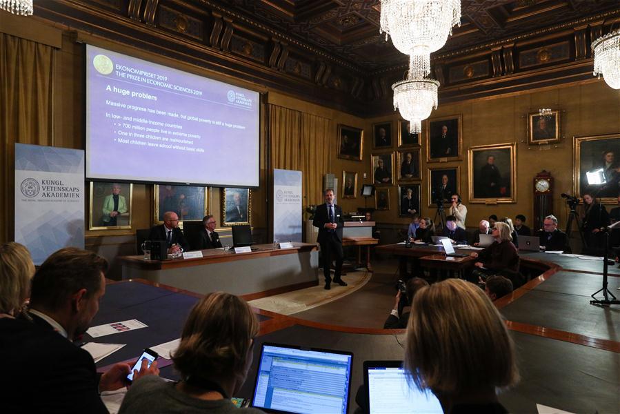 Photo taken on Oct. 14, 2019 shows the announcement of the winners of the 2019 Nobel Prize in Economics at the Royal Swedish Academy of Sciences, Stockholm, Sweden. The 2019 Nobel Prize in Economics has been awarded to Abhijit Banerjee, Esther Duflo and Michael Kremer "for their experimental approach to alleviating global poverty," the Royal Swedish Academy of Sciences announced Monday. (Xinhua/Zheng Huansong)