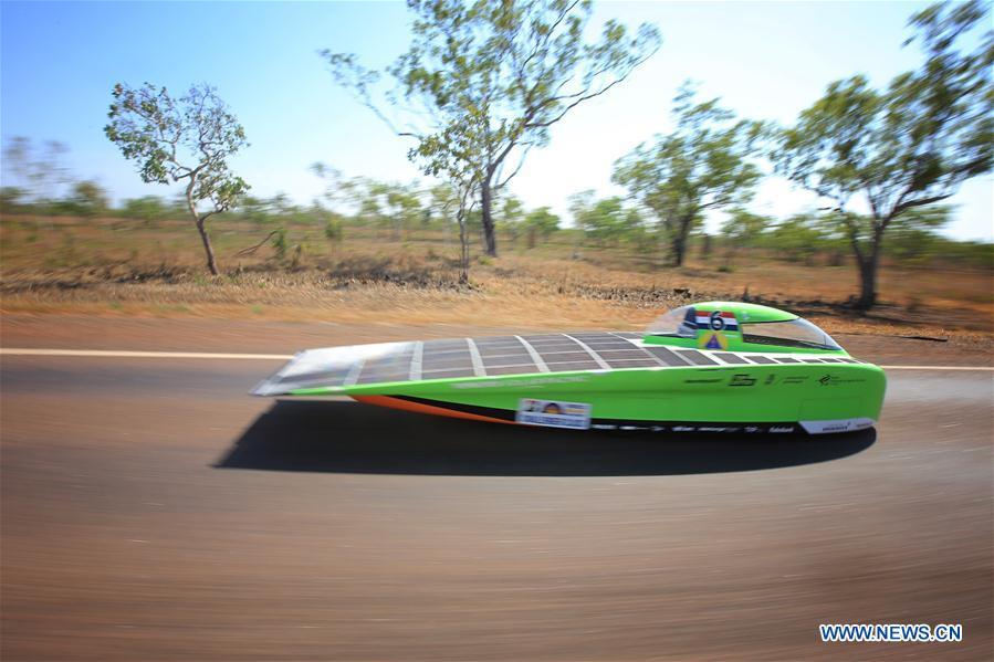 Top Dutch Solar Racing team car with pole position starts the race during the World Solar Challenge in Darwin, Northern Territory in Australia on Oct. 13, 2019. (Photo provided by Bridgestone World Solar Challenge 2019 via Xinhua)