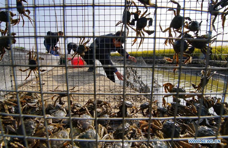 Farmers collect crabs raised in rice fields in Caofeidian District of Tangshan City, north China's Hebei Province, Oct. 14, 2019. Over 21,000 hectares of paddy field in Caofeidian District has entered harvest season recently. (Xinhua/Yang Shiyao)