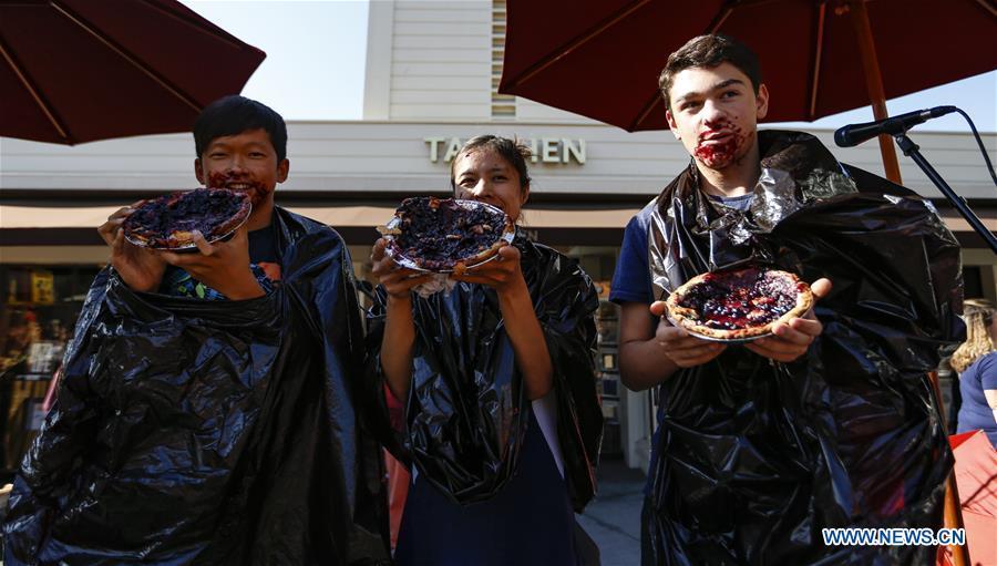 People take part in the Hands Free Pie Eating Contest during the 85th Fall Festival at the Original Farmers Market in Los Angeles, the United States, on Oct. 13, 2019. The annual Fall Festival is held here on Oct. 12 and 13 to celebrate the fall harvest with various family-friendly activities. (Xinhua/Li Ying)