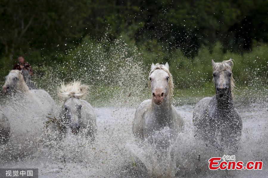 A group of 20 rare Camargue horses are pictured charging into the Rhone in rural southern France. (Photo/VCG)