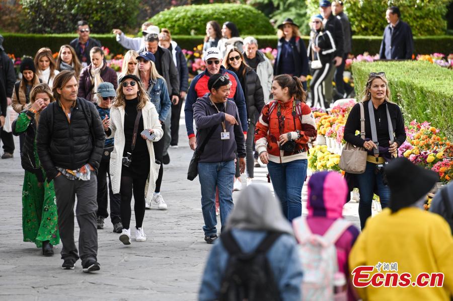 Tourists are seen near the Potala Palace in Lhasa, South China’s Tibet Autonomous Region, Oct. 15, 2019. The region has introduced a new round of incentives to boost tourism from Oct. 15 to March 15. Visitors can make reservations in advance and receive free admission to the Potala Palace during this period. (Photo: China News Service/He Penglei)