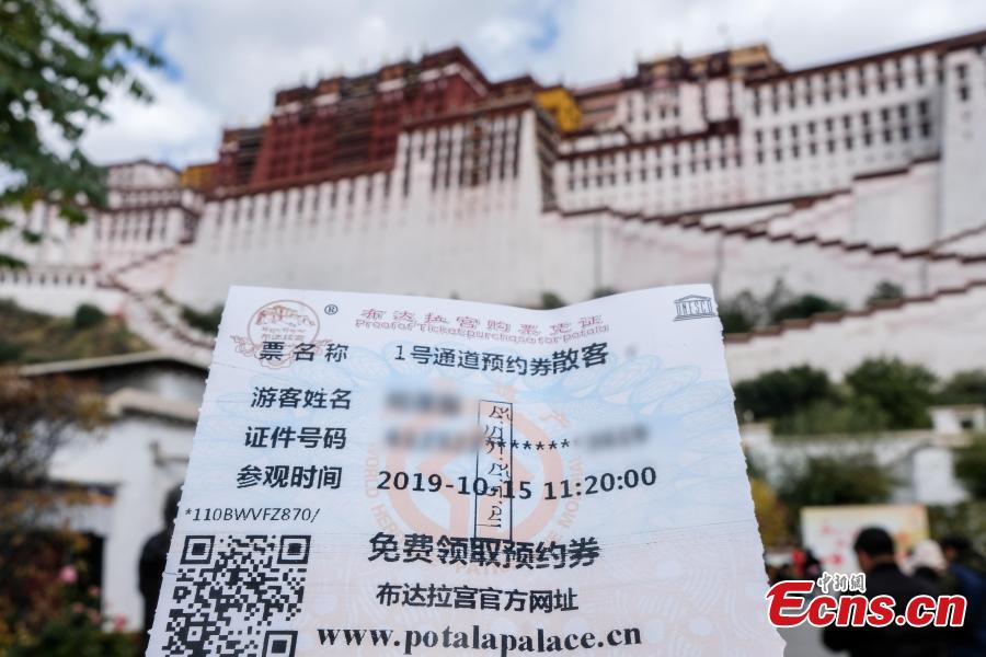 A visitor shows a ticket to enter the Potala Palace in Lhasa, South China’s Tibet Autonomous Region, Oct. 15, 2019. The region has introduced a new round of incentives to boost tourism from Oct. 15 to March 15. Visitors can make reservations in advance and receive free admission to the Potala Palace during this period. (Photo: China News Service/He Penglei)
