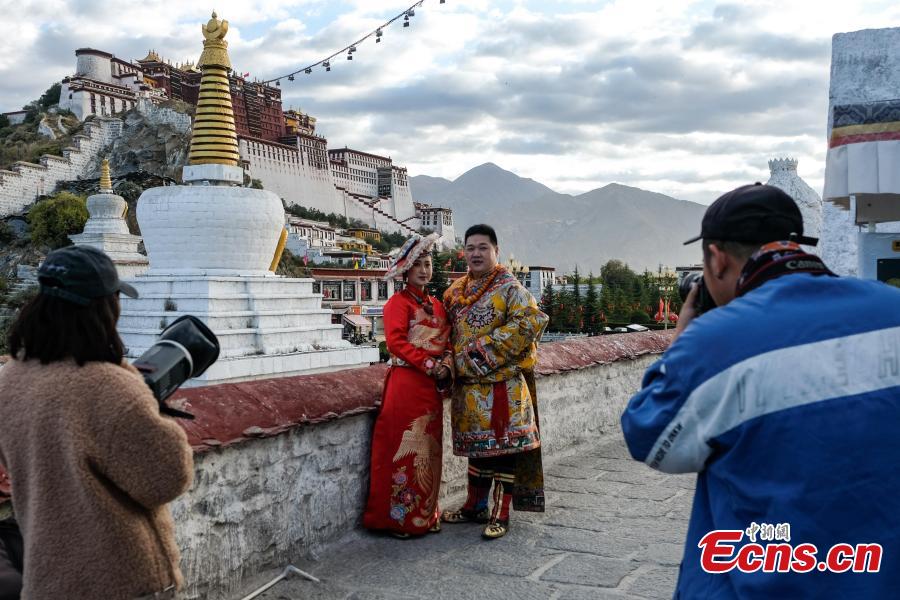 A young couple pose for photos with the Potala Palace, a Tibetan Buddhism heritage site, as the backdrop in Lhasa, South China’s Tibet Autonomous Region, Oct. 15, 2019. The region has introduced a new round of incentives to boost tourism from Oct. 15 to March 15. Visitors can make reservations in advance and receive free admission to the Potala Palace during this period. (Photo: China News Service/He Penglei)