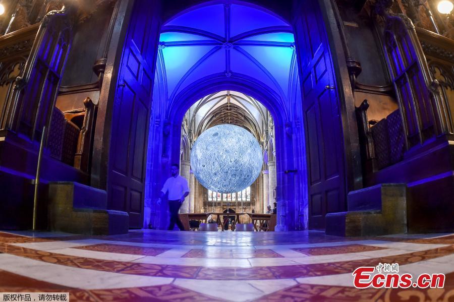Luke Jerram's 'Museum of the Moon', a light and sound installation that includes a replica of the moon seven metres in diameter, hangs in the nave at Gloucester Cathedral ahead of its opening to the public on October 16, 2019. (Photo/Agencies)