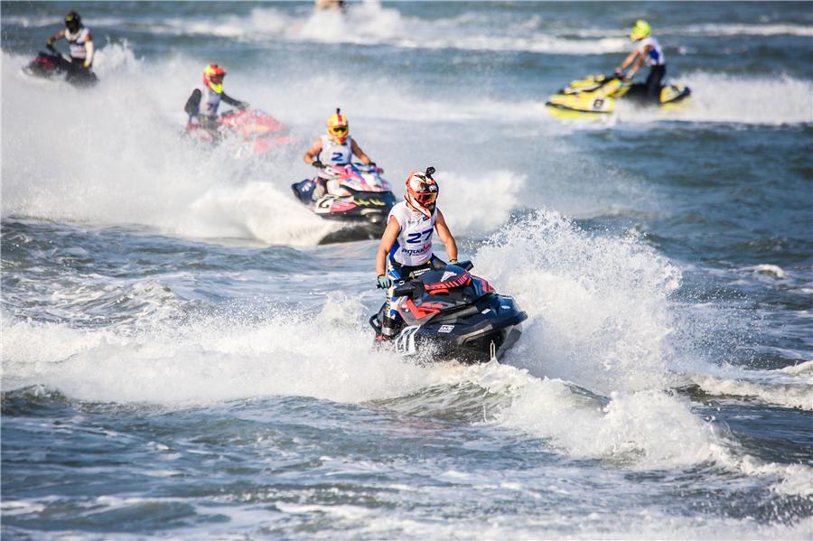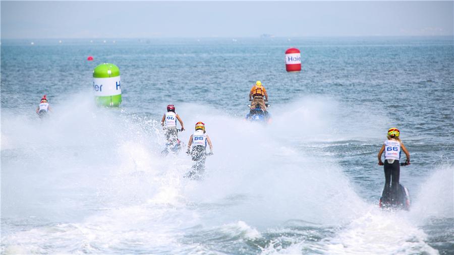 Riders compete in the Union Internationale Motonautique - Aquabike Promotion Grand Prix in Qingdao, East China's Shandong Province, which ended on Sunday. The event is one of the fastest, most demanding and entertaining sports on water attracting the world's best riders. (Photo provided to chinadaily.com.cn)