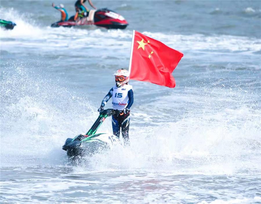 A rider from China competes in the Union Internationale Motonautique - Aquabike Promotion Grand Prix in Qingdao, East China's Shandong Province, which ended on Sunday. The event is one of the fastest, most demanding and entertaining sports on water attracting the world's best riders. (Photo provided to chinadaily.com.cn)