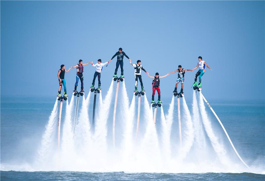 Riders are lifted into the air as they perform during the Union Internationale Motonautique - Aquabike Promotion Grand Prix in Qingdao, East China's Shandong Province, which ended on Sunday. The event is one of the fastest, most demanding and entertaining sports on water attracting the world's best riders. (Photo provided to chinadaily.com.cn)