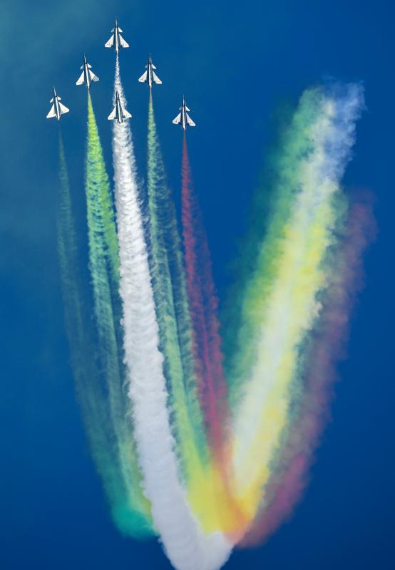 The Sky Wing Air demonstration team performs during an activity celebrating the 70th founding anniversary of the Chinese People's Liberation Army (PLA) air force in Changchun, capital of northeast China's Jilin Province, Oct. 17, 2019. (Xinhua/Zhang Nan)