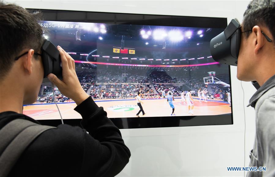 Visitors watch a live broadcast of a basketball game via VR and 5G-powered devices at the Light of the Internet Expo Center in Wuzhen, east China's Zhejiang Province, Oct. 19, 2019. Under the theme of "Smart, connectivity, openness and cooperation: jointly build a community of shared future in cyberspace," the 6th World Internet Conference (WIC) will be held from Oct. 20 to 22 in Wuzhen. Focusing on science and technology, industries and economy, humanity and society, and cooperation and governance, the conference will see 20 sub-forums, covering popular and cutting-edge topics such as artificial intelligence, 5G and industrial digitalization. (Xinhua/Zhang Xiaoyu)
