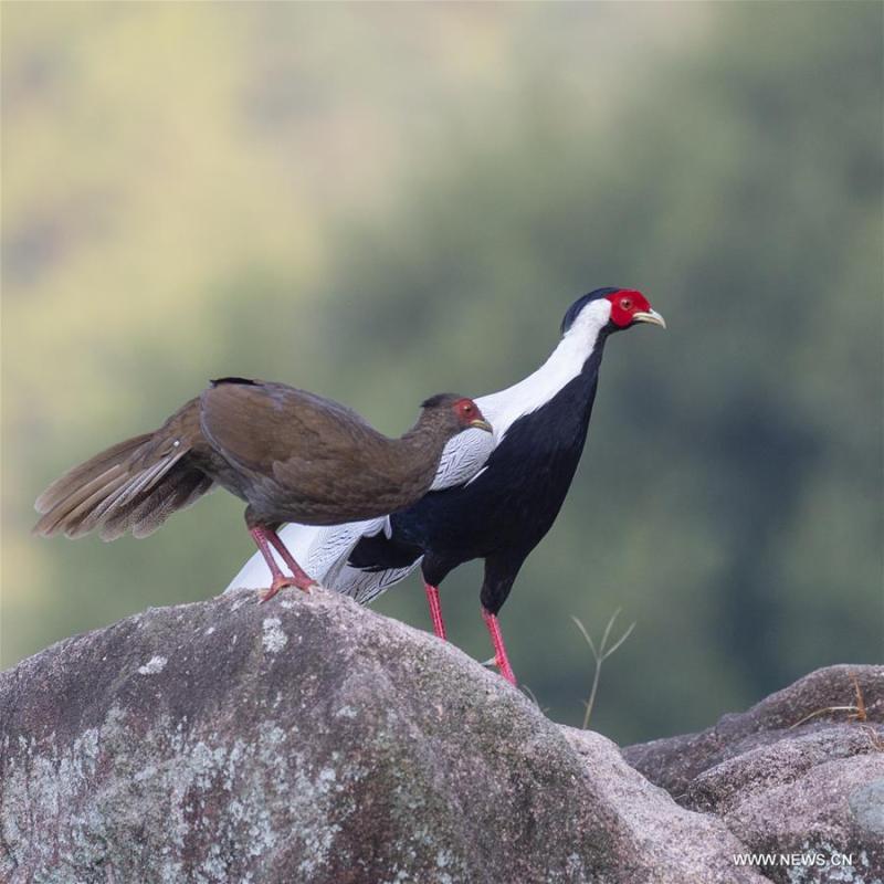 Silver pheasants rest on a rock at the Exiandong nature reserve in Nanjing County, southeast China's Fujian Province, Oct. 20, 2019. (Xinhua/Mei Yongcun)