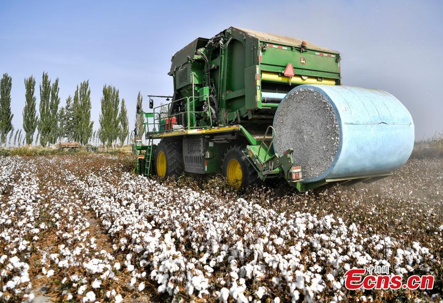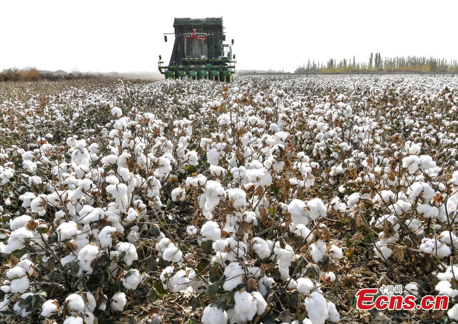 A machine is used to harvest cotton in Gulebage Town, Xayar County, Northwest China’s Xinjiang Uyghur Autonomous Region, Oct. 21, 2019. The county, an important base of high-quality cotton in China, has cotton plantations covering more than 120,000 hectares. (Photo: China News Service/Liu Xin)