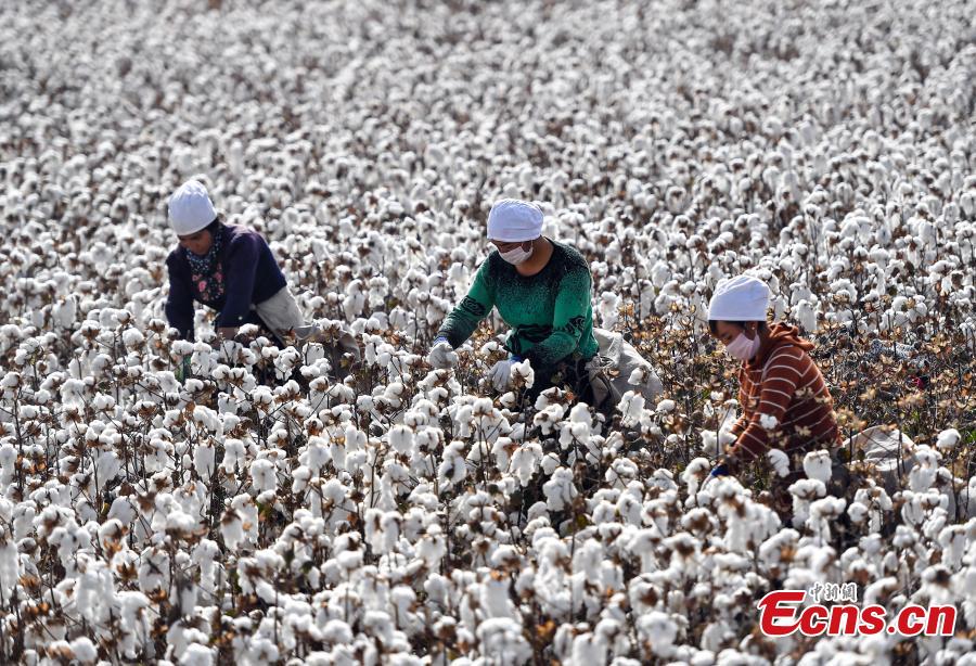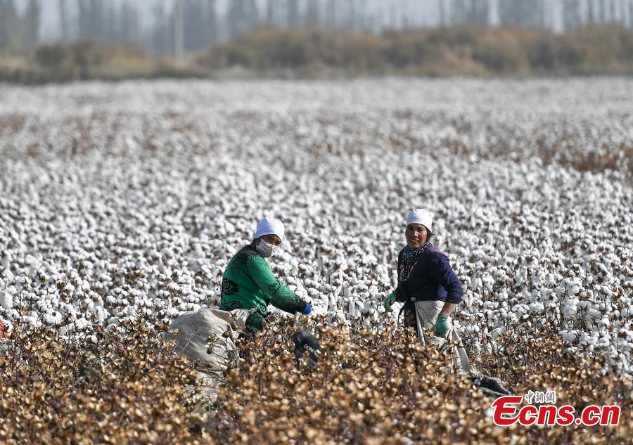 Farmers harvest cotton in Gulebage Town, Xayar County, Northwest China’s Xinjiang Uyghur Autonomous Region, Oct. 21, 2019. The county, an important base of high-quality cotton in China, has cotton plantations covering more than 120,000 hectares. (Photo: China News Service/Liu Xin)