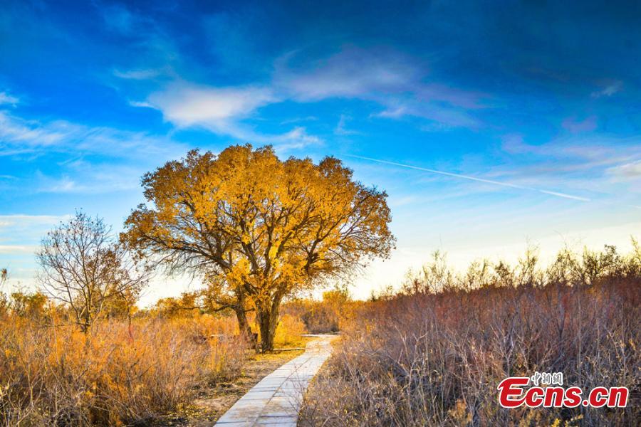 A view of a forest of desert poplar or populus euphratica in Dunhuang, Northwest China’s Gansu Province. The trees draw tourists as their leaves turn a golden yellow, contrasting with the vast blue skies of the Gobi area. (Photo: China News Service/ Wang Binyin)