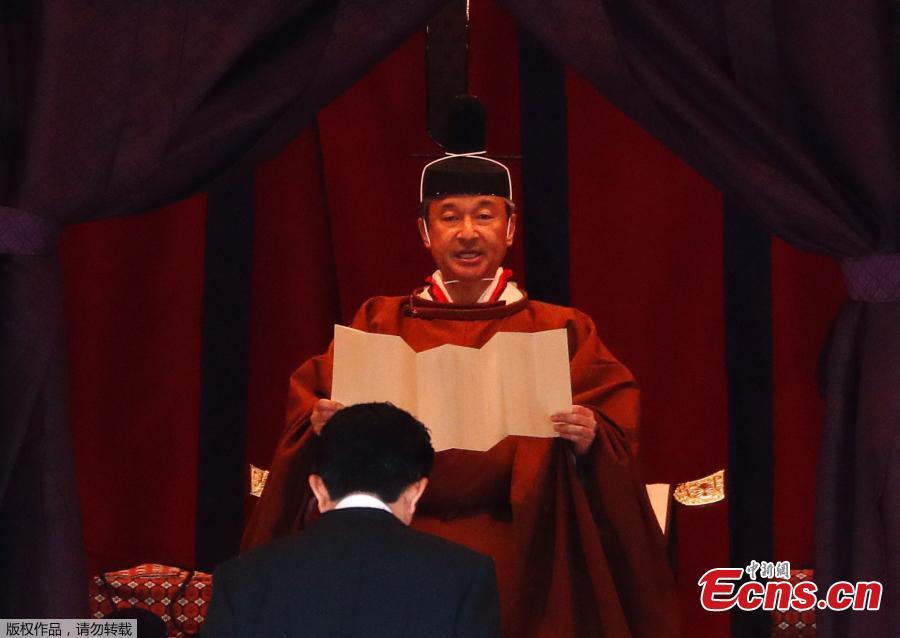 Emperor Naruhito officially proclaims his ascension to the Chrysanthemum Throne during an enthronement ceremony at the Imperial Palace in Tokyo on October 22, 2019. (Photo/Agencies)