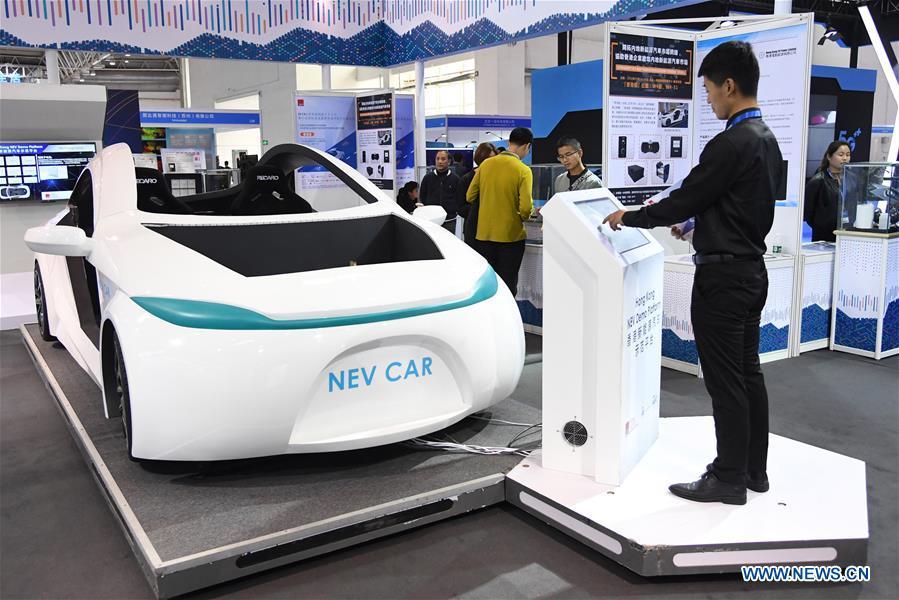 A self-driving vehicle is on display at World Intelligent Connected Vehicles Conference 2019 in Beijing, capital of China, Oct. 22, 2019. The four-day World Intelligent Connected Vehicles Conference 2019 opened Tuesday at New China International Exhibition Center, featuring exhibitions, forums, dialogues with entrepreneurs, as well as on-site discussions in vehicle testing zones. (Xinhua/Ren Chao)