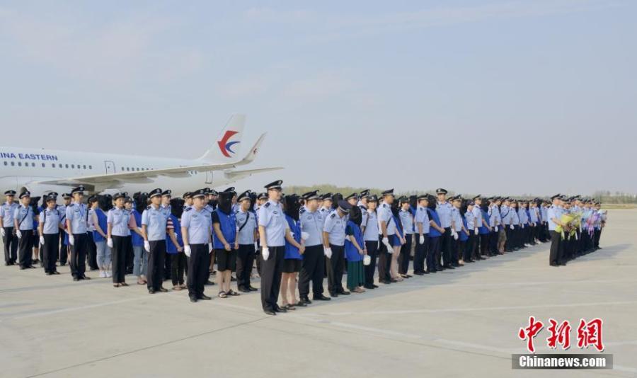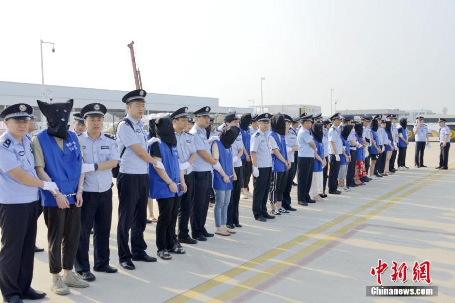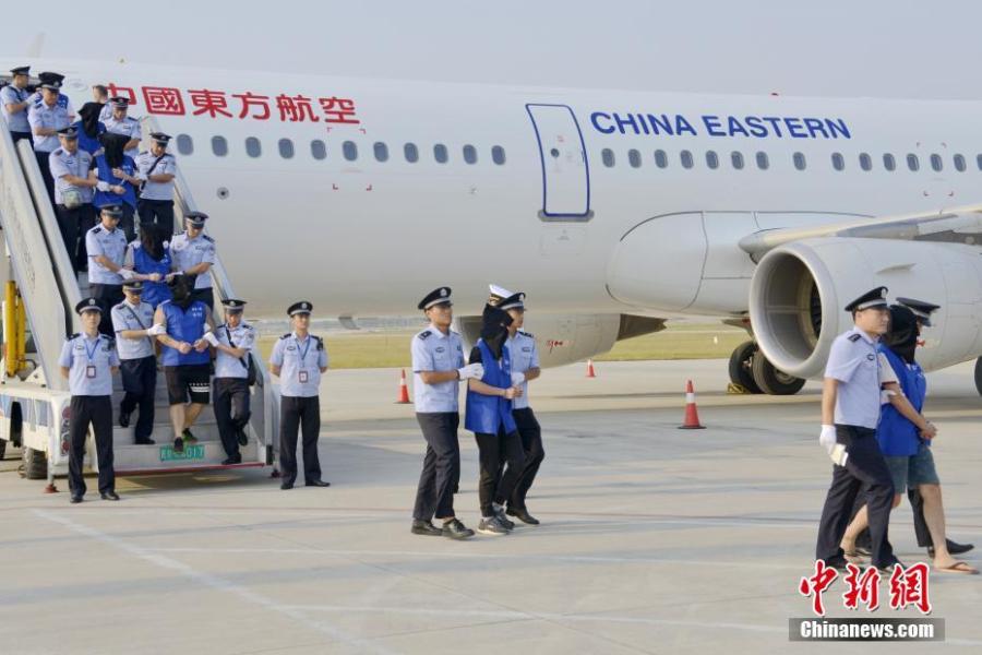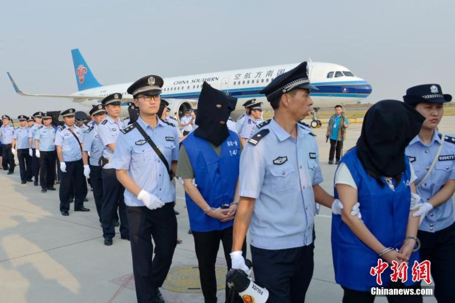 Chinese nationals suspected of involvement in transnational telecom fraud deported from Cambodia arrive at Xinqiao airport in Hefei, Anhui Province, Oct. 23, 2019, under the escort of Chinese police. (Photo/China News Service)
