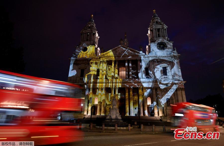 London buses pass as light projections depicting Second World War images are seen on the west face of St Paul's Cathedral as part of the forthcoming 'Where Light Falls' illuminations and poetry readings, in London, Britain, October 23, 2019. (Photo/Agencies)