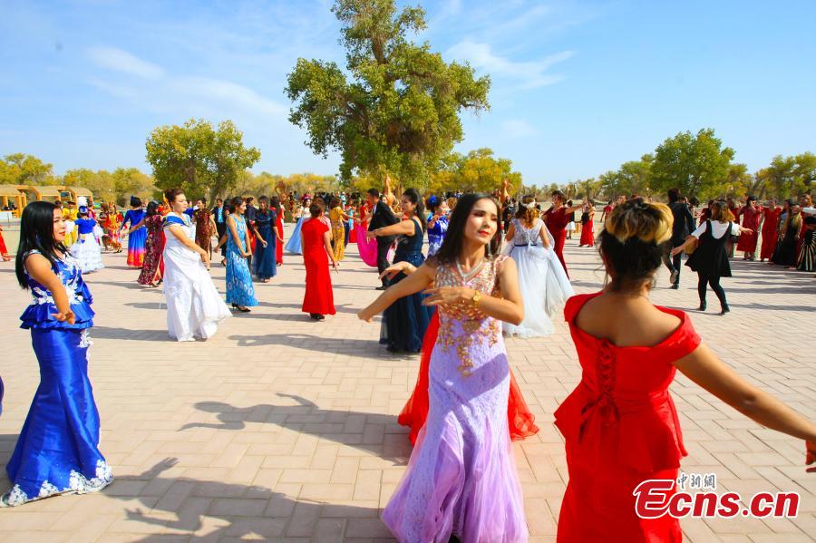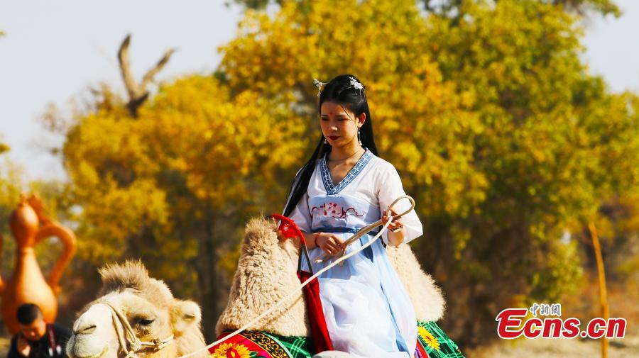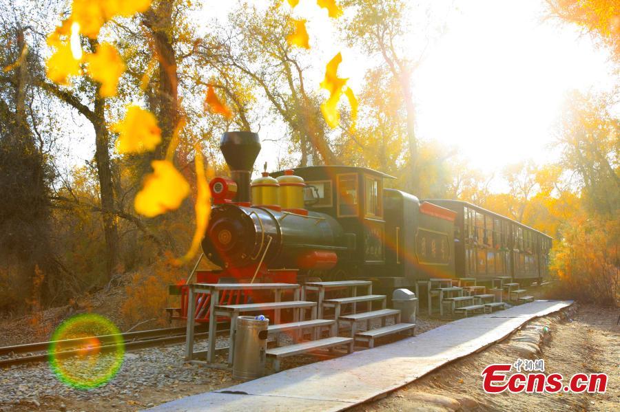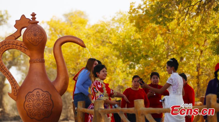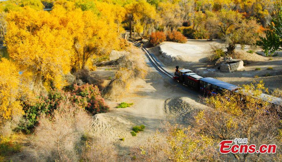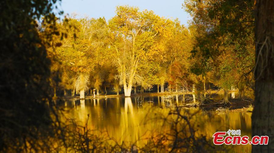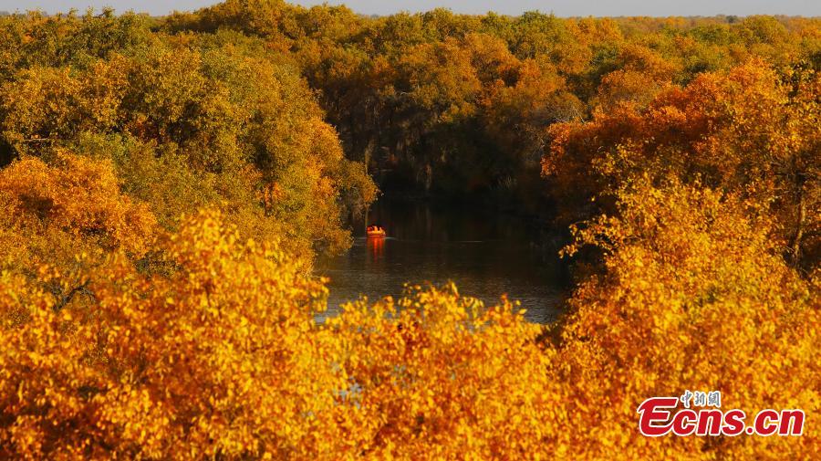 A view of a forest of desert poplar or populus euphratica in the lower reaches of the Tarim River in Luntan County, Northwest China's Xinjiang Uygur Autonomous Region. The county is home to 436,000 mu of desert poplar, making it one of the best places to appreciate the unique desert flora, especially in autumn when the tree's leaves turn yellow. Since 2000, local authorities have dispatched water 20 times to help conserve the ecology of the park, a national 4A-level (Chinese second highest rank for tourist attractions) scenic spot. (Photo/China News Service)