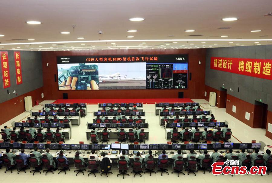 Photo shows a fifth prototype of China's large passenger jet C919 taking off from a runway at Shanghai Pudong International Airport, Oct. 24, 2019. Ater 97 minutes of flight, the 5th C919 jumbo jet completed several tests and initial control checks on aircraft systems. (Photo/China News Service)