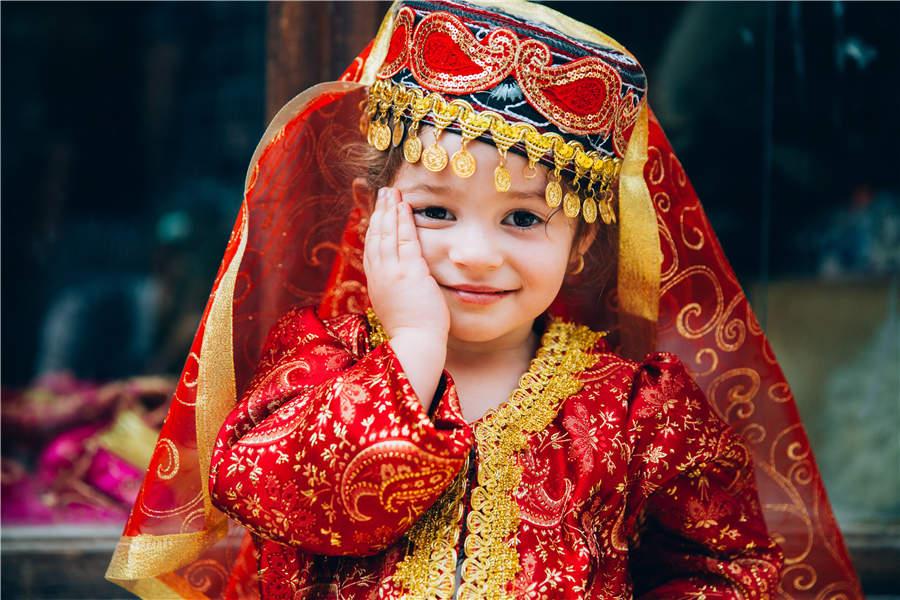 A little girl wears ethnic dress in a village in the Caucasus Mountains. (Photo provided by People's Daily)