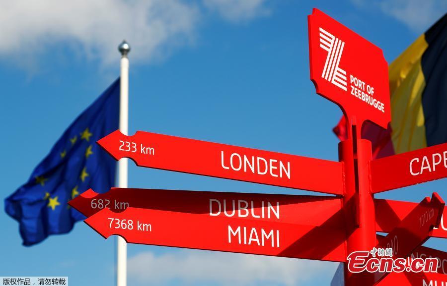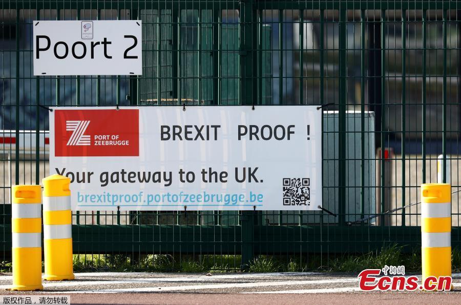 A sign is seen in front of an EU flag at the port of Zeebrugge after British police found bodies inside a lorry container in Grays, Essex, in Zeebrugge, Belgium October 24, 2019. (Photo/Agencies)