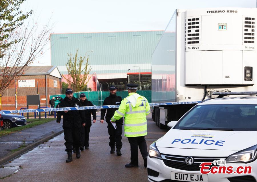 Police officers are seen at the scene where bodies were discovered in a lorry container, in Grays, Essex, Britain October 24, 2019. (Photo/China News Service)