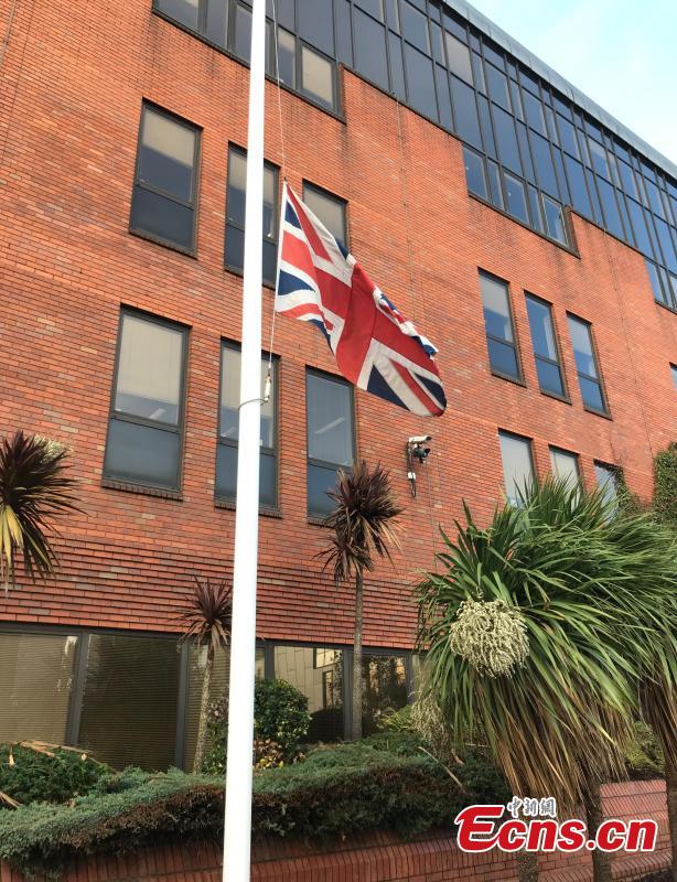 Flag is flown at half-staff on Thursday outside Thurrock Council, UK, near where the bodies of 39 Chinese nationals were found Wednesday in a refrigerated truck trailer. (Photo/China News Service)