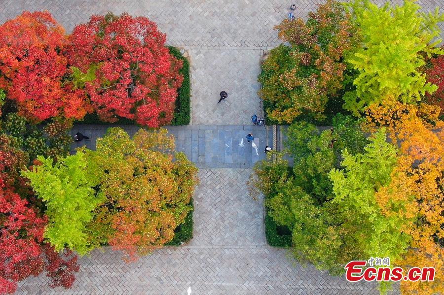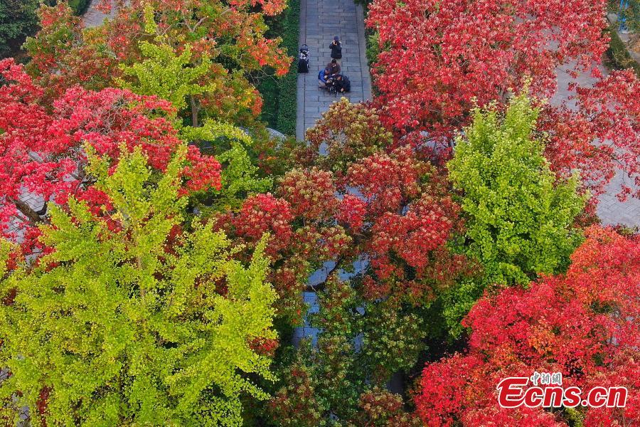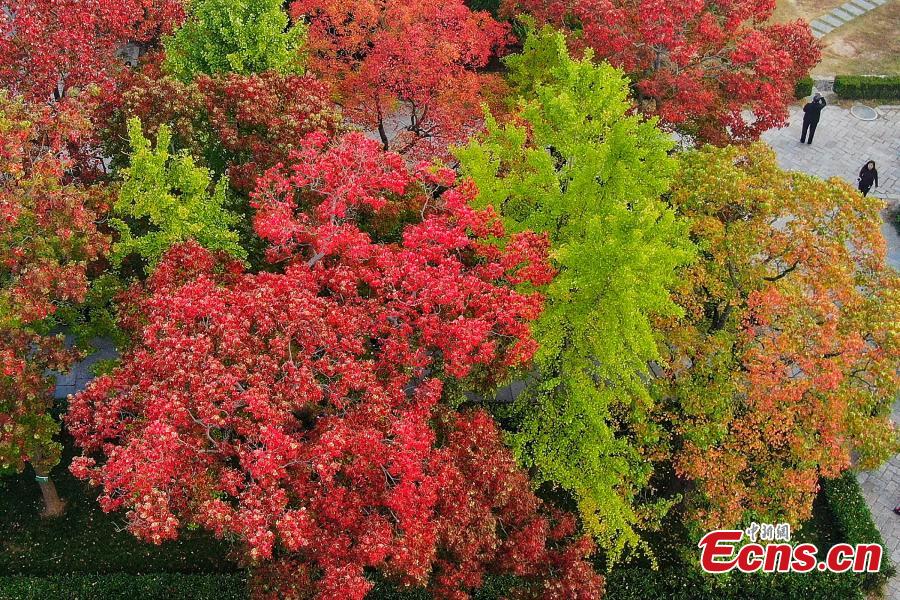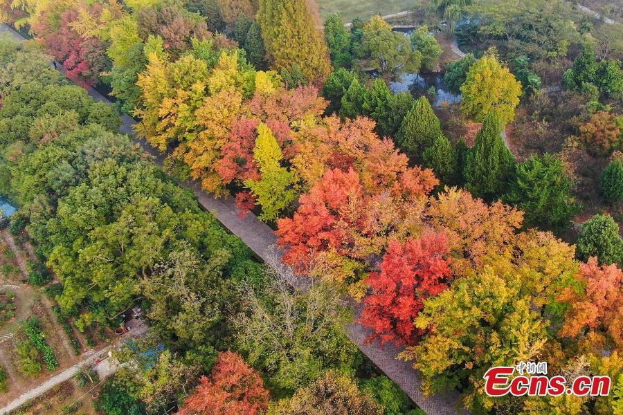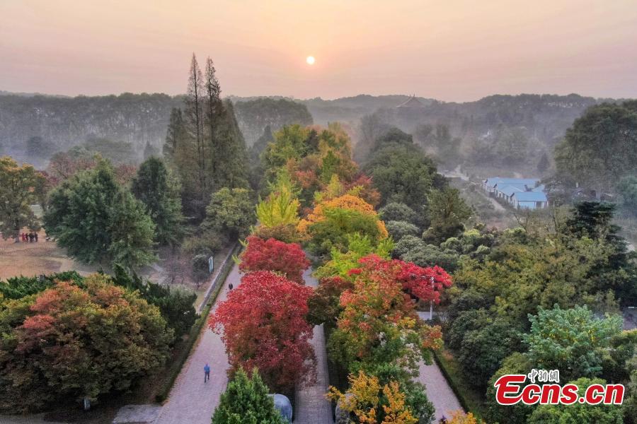 Shixiang Road, flanked by trees with autumn foliage, at the Ming Xiaoling Mausoleum in Nanjing City, East China's Jiangsu Province, Oct. 24, 2019. Located at the southern foot of Purple Mountain, Xiaoling is the mausoleum of first Ming Dynasty (1368-1644) emperor Zhu Yuanzhang. Along the road are various varieties of trees that provide a spectacular view of autumn colors. (Photo: China News Service/Yang Bo)