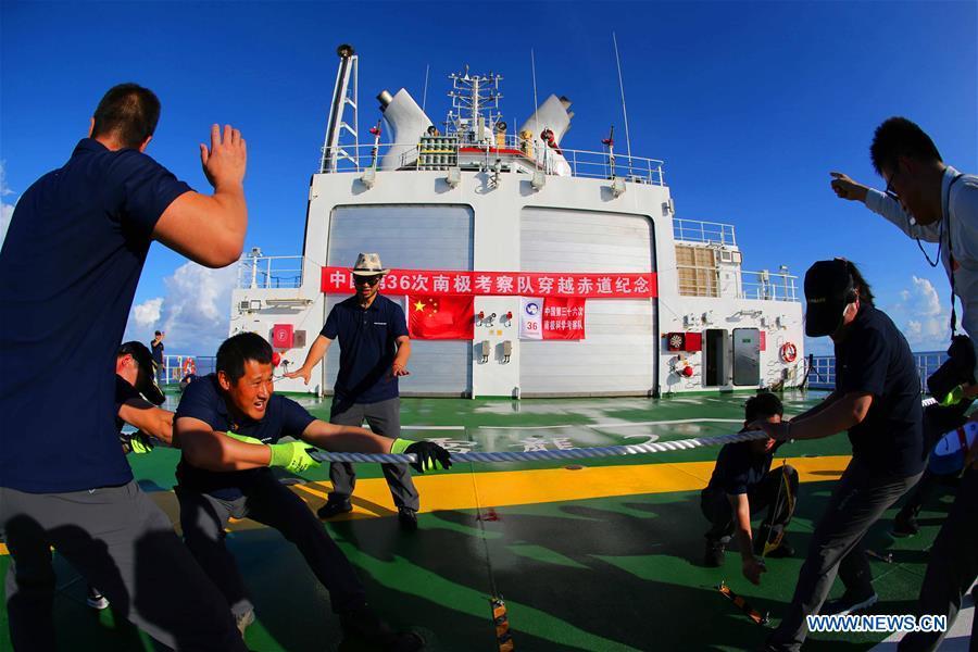 Members of China's 36th Antarctic expedition team participate in a tug-of-war competition aboard Xuelong 2 to mark its crossing the equator, Oct. 24, 2019. China's first domestically made polar icebreaker Xuelong 2, or Snow Dragon 2, crossed the equator and entered the southern hemisphere for the China's 36th Antarctic expedition after it started its maiden voyage from the southern Chinese city of Shenzhen on Oct. 15. (Xinhua/Liu Shiping)