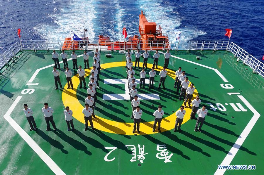 Members of China's 36th Antarctic expedition team pose for photos aboard Xuelong 2 to mark its crossing the equator, Oct. 24, 2019. China's first domestically made polar icebreaker Xuelong 2, or Snow Dragon 2, crossed the equator and entered the southern hemisphere for the China's 36th Antarctic expedition after it started its maiden voyage from the southern Chinese city of Shenzhen on Oct. 15. (Xinhua/Liu Shiping)