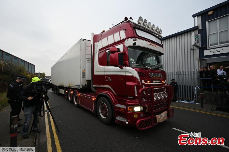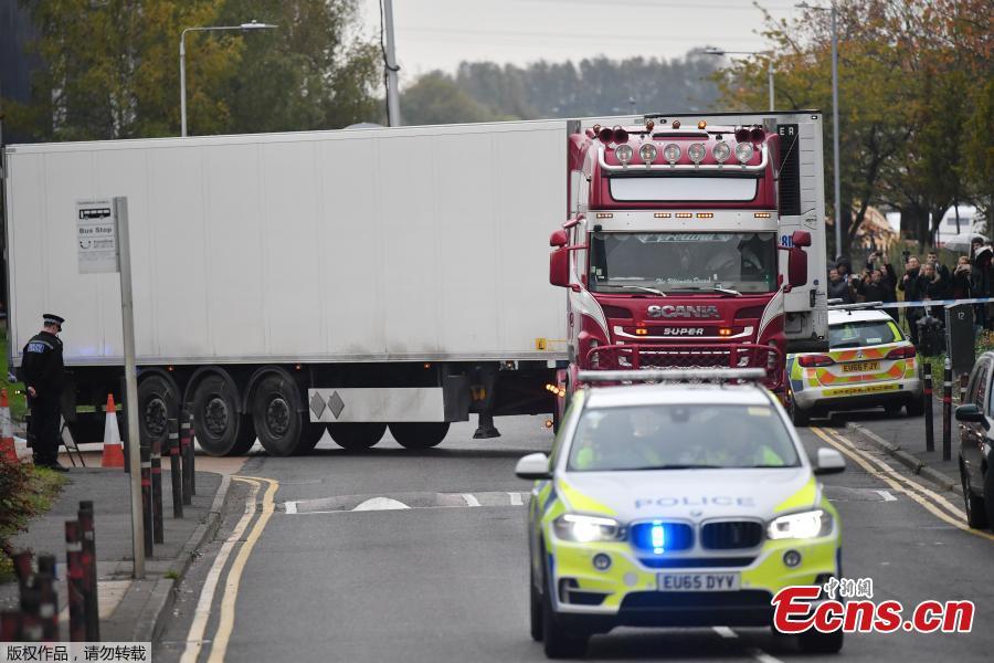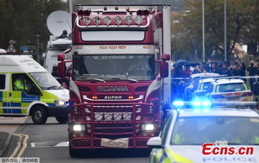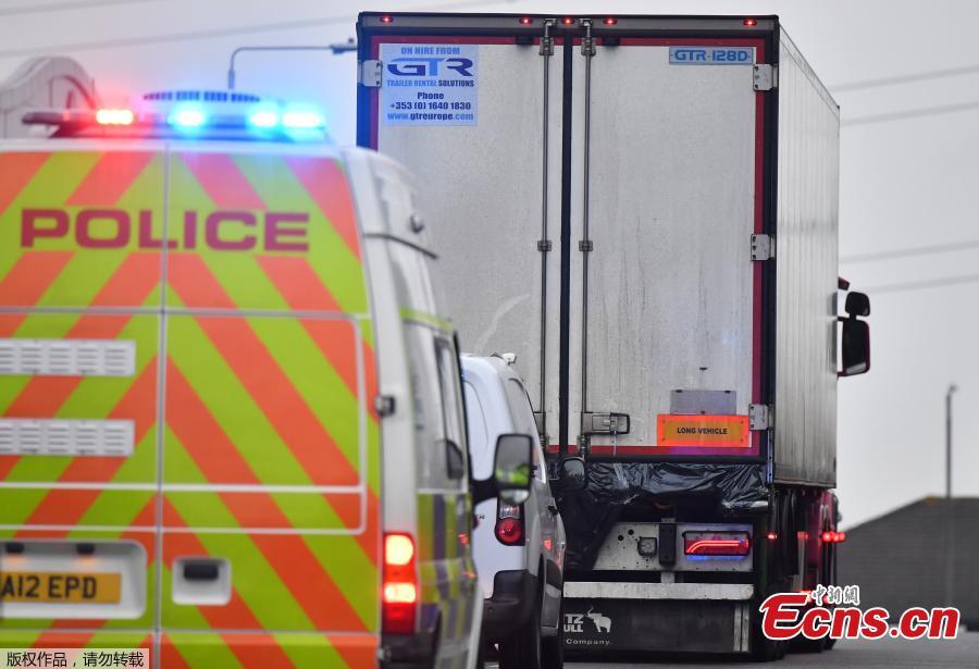 Photo taken on Oct. 23, 2019, shows the container lorry where 39 people were found dead inside leaving Waterglade Industrial Park in Grays, Essex, heading towards Tilbury Docks under police escort. A murder investigation has been launched after 39 bodies were found in a container at the back of the truck. (Photo/Agencies)