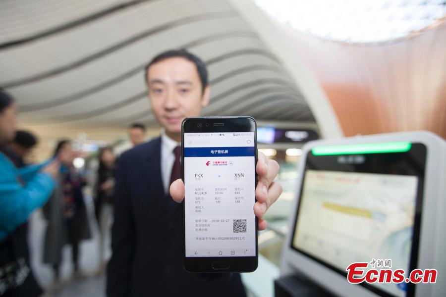 A staff member of China Eastern Airlines with an electronic boarding pass at Beijing Daxing International Airport, Oct. 27, 2019. (Photo: China News Service/Zhang Yun)