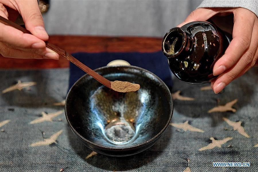 A girl in traditional costume puts tea powders into a cup during the show of a traditional Chinese tea-boiling technique named "Dian Tea" at Masha Town in Jianyang District of Nanping, southeast China's Fujian Province, Oct. 27, 2019. "Dian Tea" is a traditional Chinese tea-boiling technique. Powder of tea leaves are put into a cup and stirred with a bamboo brush in boiling water. When white foam appears, the drink is ready. (Xinhua/Zhang Guojun)