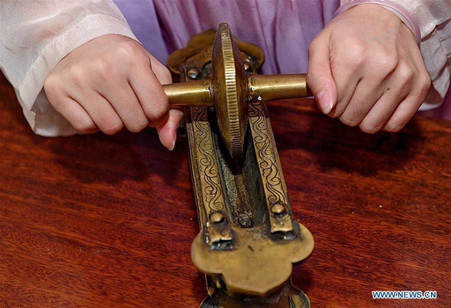 A girl in traditional costume grinds tea during the show of a traditional Chinese tea-boiling technique named "Dian Tea" at Masha Town in Jianyang District of Nanping, southeast China's Fujian Province, Oct. 27, 2019. "Dian Tea" is a traditional Chinese tea-boiling technique. Powder of tea leaves are put into a cup and stirred with a bamboo brush in boiling water. When white foam appears, the drink is ready. (Xinhua/Zhang Guojun)