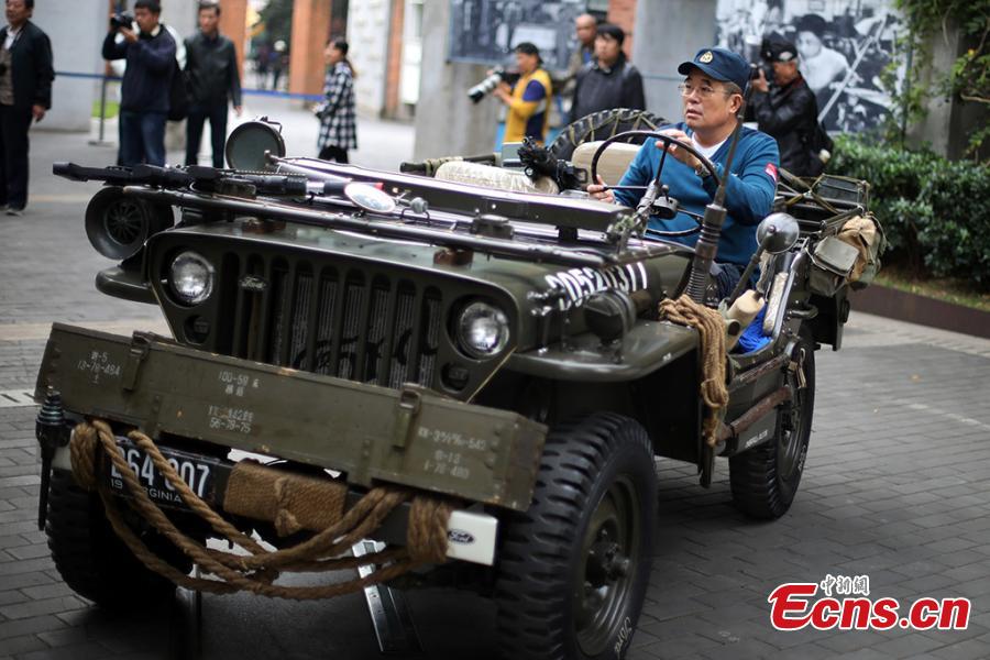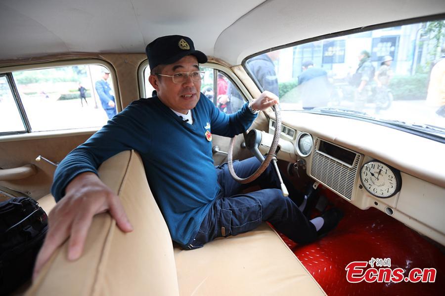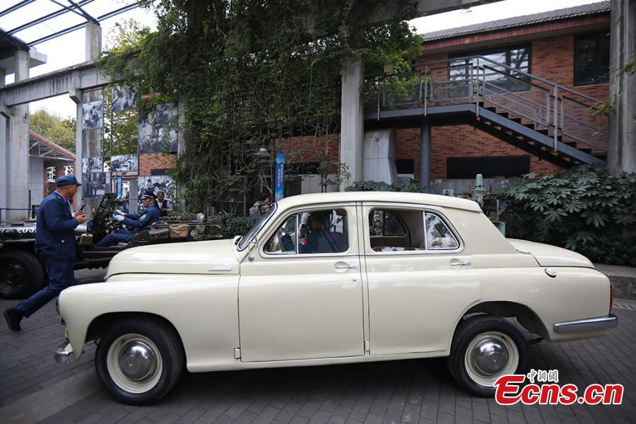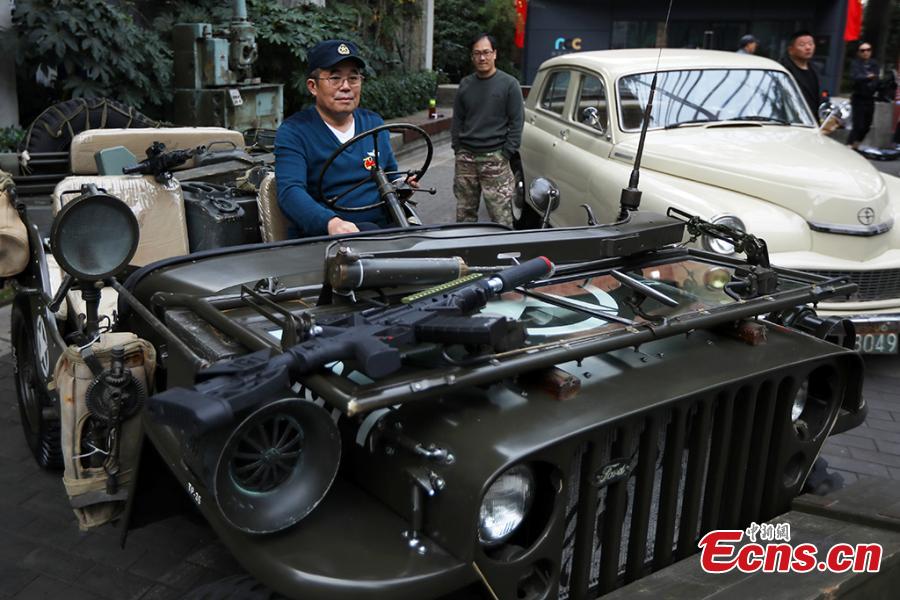 Sun Nong with four of his vintage cars in Nanjing City, Jiangsu Province, Oct. 27, 2019. The owner of a car repair show, Sun, 58, has spent more than a decade, collecting 20 vintage vehicles, including an old military car still able to be driven. (Photo: China News Service/Yang Bo)