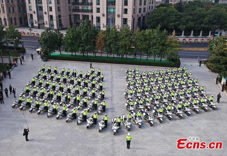 An aerial photo shows the launching ceremony for the newly formed motorbike police unit of the Huangpu Station of the Shanghai Municipal Public Security Bureau on Oct. 28, 2019. The unit has more than 100 new police motorbikes. (Photo: China News Service/Yin Liqin)