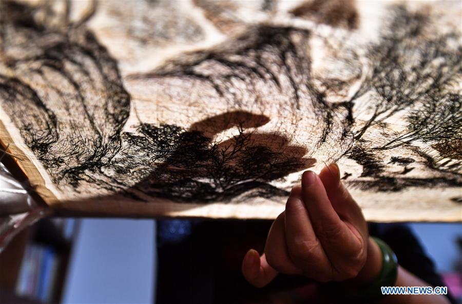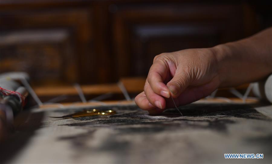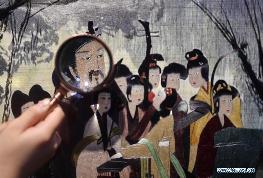 Grass linen embroidery by Zhang Xiaohong is displayed in her museum in Xinyu City, east China's Jiangxi Province, Oct. 23, 2019. Dated back to the Northern Song Dynasty (960-1127), Xiabu, or grass linen, is a kind of cloth made from ramie. Zhang Xiaohong, 61 years old, is a national representative inheritor of Xiabu embroidery. In 2002, she set up an embroidery workshop in her hometown Xinyu after studying in Tianjin and Suzhou. Throughout the years, Zhang updated the quality of the cloth and also created six ways of stitches. In 2014, she was recognized as the national representative inheritor of the intangible cultural heritage of Xiabu and also opened her own Xiabu themed museum in Xinyu. (Xinhua/Hu Chenhuan)