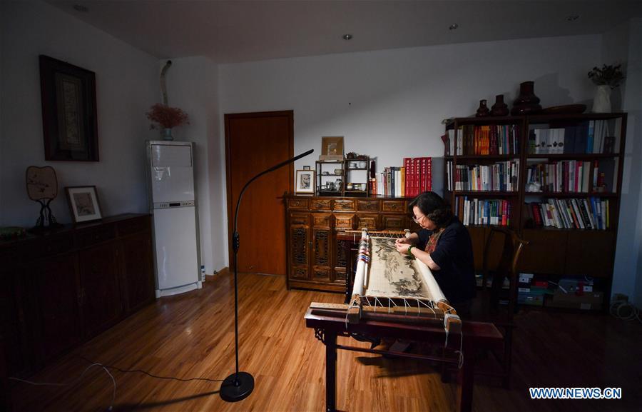 Zhang Xiaohong embroiders at her workshop in Xinyu City, east China's Jiangxi Province, Oct. 23, 2019. Dated back to the Northern Song Dynasty (960-1127), Xiabu, or grass linen, is a kind of cloth made from ramie. Zhang Xiaohong, 61 years old, is a national representative inheritor of Xiabu embroidery. In 2002, she set up an embroidery workshop in her hometown Xinyu after studying in Tianjin and Suzhou. Throughout the years, Zhang updated the quality of the cloth and also created six ways of stitches. In 2014, she was recognized as the national representative inheritor of the intangible cultural heritage of Xiabu and also opened her own Xiabu themed museum in Xinyu. (Xinhua/Hu Chenhuan)