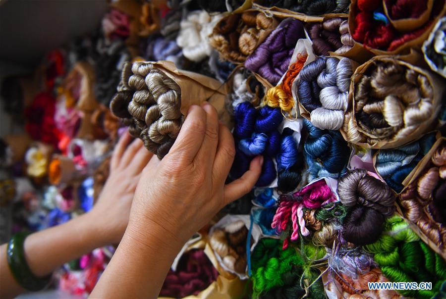 Zhang Xiaohong selects threads at her workshop in Xinyu City, east China's Jiangxi Province, Oct. 23, 2019. Dated back to the Northern Song Dynasty (960-1127), Xiabu, or grass linen, is a kind of cloth made from ramie. Zhang Xiaohong, 61 years old, is a national representative inheritor of Xiabu embroidery. In 2002, she set up an embroidery workshop in her hometown Xinyu after studying in Tianjin and Suzhou. Throughout the years, Zhang updated the quality of the cloth and also created six ways of stitches. In 2014, she was recognized as the national representative inheritor of the intangible cultural heritage of Xiabu and also opened her own Xiabu themed museum in Xinyu. (Xinhua/Hu Chenhuan)