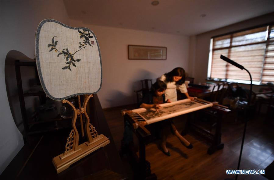 Zhang Xiaohong (L) embroiders with a worker at her workshop in Xinyu City, east China's Jiangxi Province, Oct. 23, 2019. Dated back to the Northern Song Dynasty (960-1127), Xiabu, or grass linen, is a kind of cloth made from ramie. Zhang Xiaohong, 61 years old, is a national representative inheritor of Xiabu embroidery. In 2002, she set up an embroidery workshop in her hometown Xinyu after studying in Tianjin and Suzhou. Throughout the years, Zhang updated the quality of the cloth and also created six ways of stitches. In 2014, she was recognized as the national representative inheritor of the intangible cultural heritage of Xiabu and also opened her own Xiabu themed museum in Xinyu. (Xinhua/Hu Chenhuan)