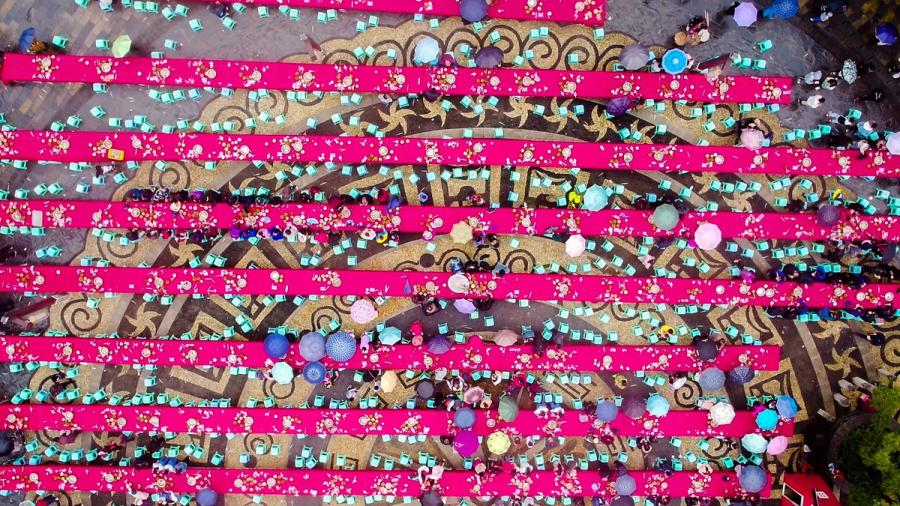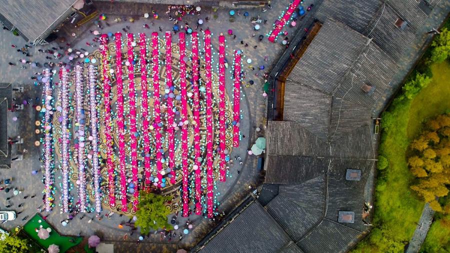 An aerial photo taken on Oct 26, 2019 shows a section of the long table banquet arrangement. (Photo provided to chinadaily.com.cn)