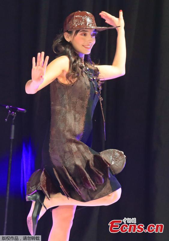 A model presents a chocolate studded dress during a show as part of the chocolate fair in Paris, Tuesday, Oct. 29, 2019. The fair starts Oct. 29 and lasts until Nov. 3. (Photo/Agencies)