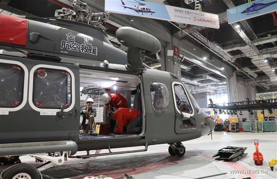 Staff members adjust a helicopter that is to be exhibited at the National Exhibition and Convention Center (Shanghai), the venue of the second China International Import Expo (CIIE), in Shanghai, east China, Oct. 30, 2019. (Xinhua/Fang Zhe)
