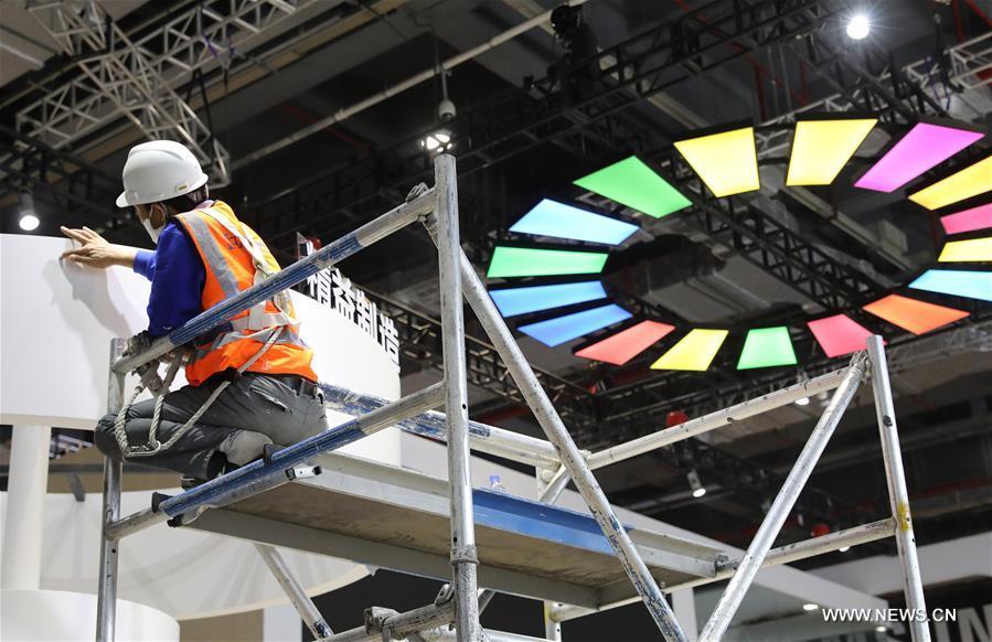 Technicians work at the National Exhibition and Convention Center (Shanghai), the venue of the second China International Import Expo (CIIE), in Shanghai, east China, Oct. 30, 2019. (Xinhua/Fang Zhe)