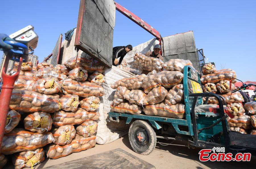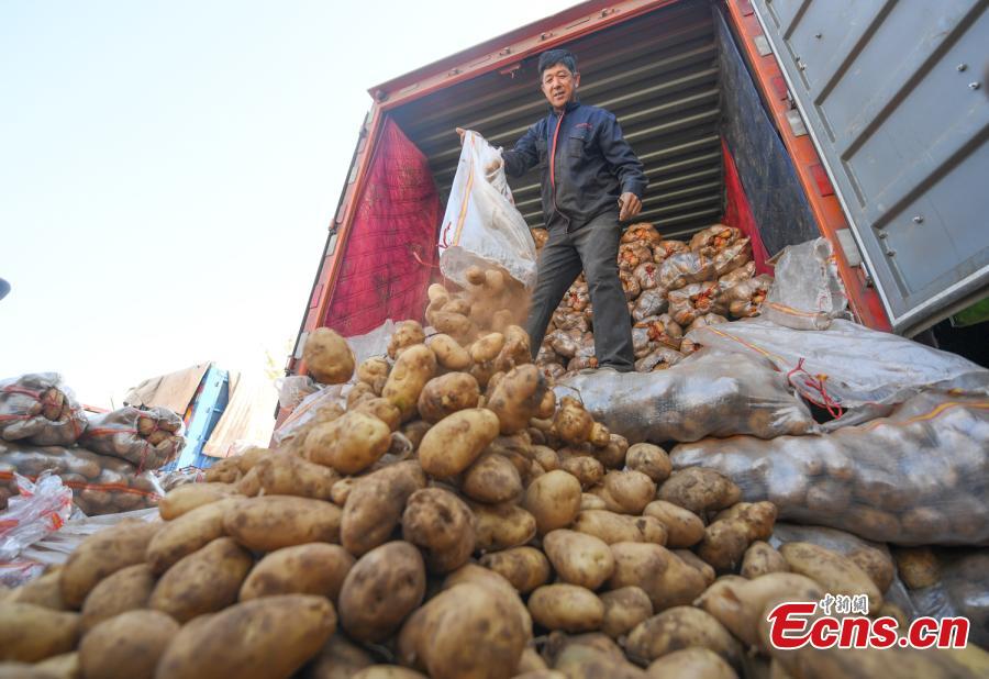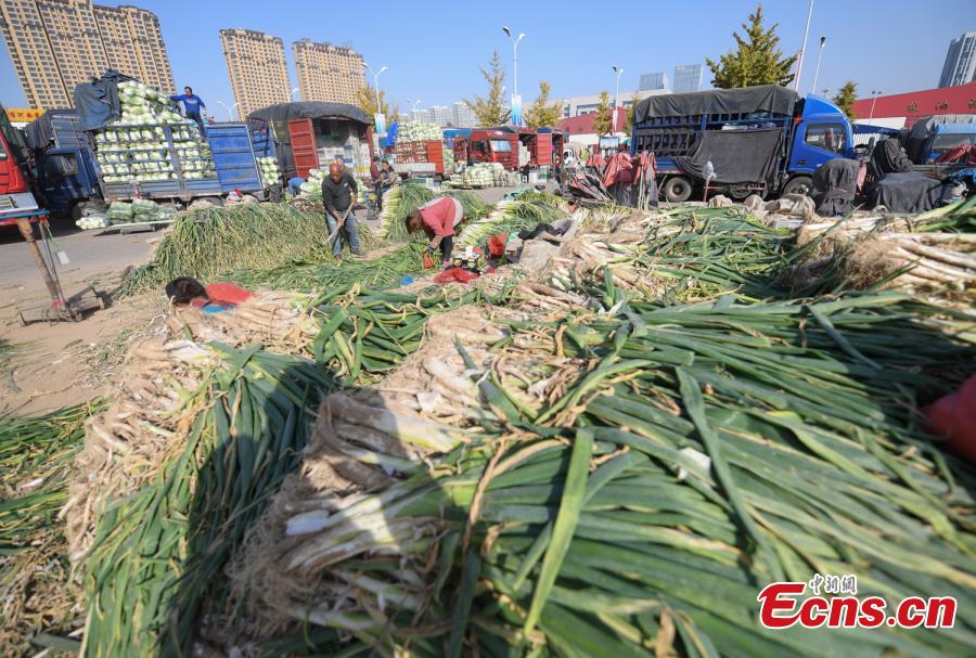 A vegetable wholesale market in Taiyuan City, North China’s Shanxi Province, Oct. 30, 2019. As temperatures drop in northern China, sales of vegetables saved for winter use, such as Chinese cabbage, potatoes and green Chinese onion, are rising. (Photo: China News Service/Wu Junjie)